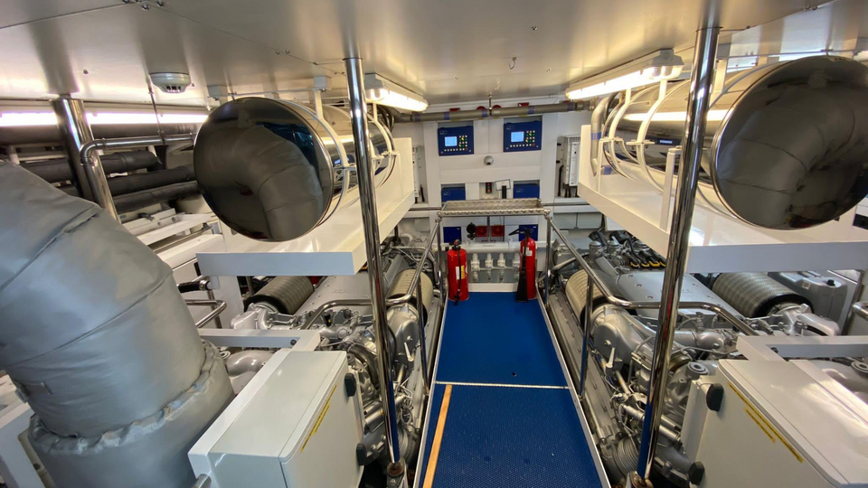 crew quarters are located in the garage area. This type ofspecial lay out allows the owner's cabin an entire extra floor of bathroom area to maximize the space and privacy, which makes her a unique super yacht.